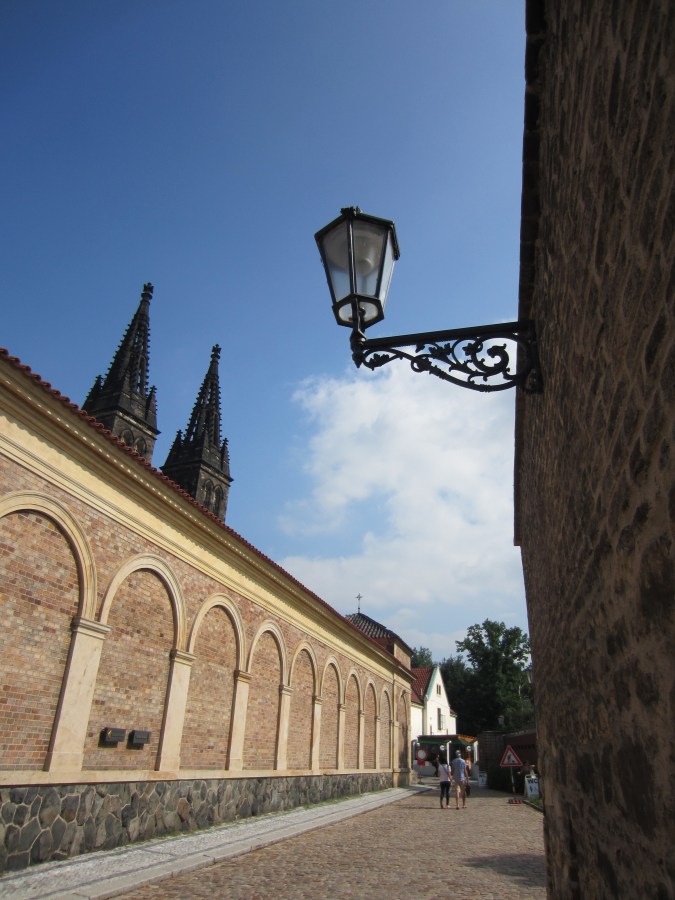 The spires of the Basilica of St Peter and St Paul emerging behind the cemetery wall